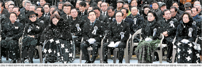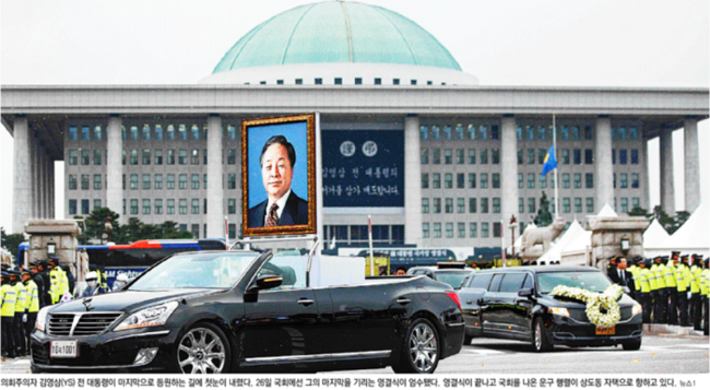 김영삼 전 대통령이 26일 영면에 들었다. 김 전 대통령의 영결식은 이날 부인 손명순 여사와 차남 현철씨 등 유족 및 이명박 대통령 내외와 각계 대표 등 7000여명이 참석한 가운데 국회의사당에서 엄수됐다. 이날 모든 주요 신문들은 운구행렬과 영결식의 모습을 1면 사진으로 실었다.