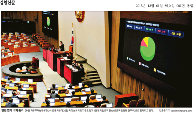 경향신문은 "한중 자유무역협정(FTA) 비준동의안이 30일 국회 본회의 전자투표 결과 196명의 압도적 찬성으로 통과됐다"고 밝혔다. 국민일보 또한 '우여곡절 끝 가결'이라는 제목의 사진 설명을 통해 재적 의원 300명 중 265명이 투표에 참여해 찬성 196표, 반대 33표, 기권 36표로 가결됨을 알렸다. 한중 FTA는 지난해 11월 박근혜 대통령과 시진핑 중국 국가주석이 협상 타결을 선언한 지 1년, 올해 6월 양국 정상이 협정에 정식 서명한 지 6개월만에 이뤄졌다.