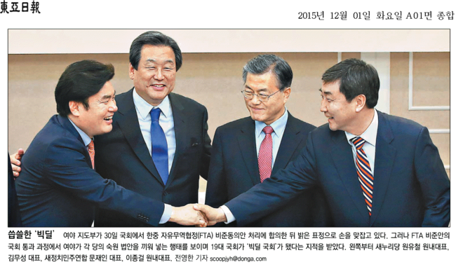 이날 동아일보는 '씁쓸한 빅딜'이라는 제목의 사진 설명을 통해 관련 소식을 전했다. 동아일보에 따르면 국회 통과 과정에서 여야는 각 당의 숙원 법안을 끼워 넣는 행태를 보였다. 동아는 "여권이 한중 FTA 연내 발효라는 마지노선에 쫓기고 야당은 2일 예산안 통과라는 데드라인에 몰리면서 협상판이 커졌고 상관없는 법안들이 '패키디 딜'로 묶였다"고 지적했다. 이날 여야는 누리과정 예산의 국고 지원 폭에 대한 이견 탓에 최종 합의문에 담진 못했지만 여당이 추진하는 관광진흥법과 야당의 대리점거래 공정화법이 주고받기 식으로 거래됐다.