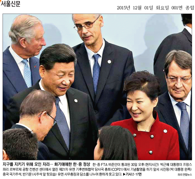 서울신문과 조선일보, 중앙일보는 프랑스 파리에서 진행되고 있는 유엔기후변화협약 소식을 전했다. 서울신문은 '지구를 지키기 위해 모인 자리...화기애애한 한중 정상'이라는 제목의 사진 설명을 통해 박근혜 대통령이 시진핑 중국 국가주석, 반기문 유엔 사무총장과 담소를 나누며 환하게 웃고 있는 모습을 담았다. 조선일보와 중앙일보도 150개국 정상들이 나란히 서서 기념촬영을 하고 있는 모습을 1면에 다뤘다. 중앙일보는 이날 박 대통령이 기조연설에서 "이번 총회에서 반드시 신기후체제를 출범시켜야 한다"는 입장을 전했다고 보도했다.