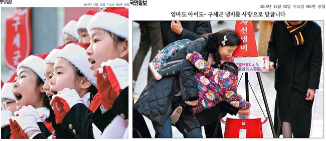 한국구세군이 1일 서울광장에서 '구세군 자선냄비 시종식'을 열고 거리 성금 모금을 시작했다. 국민일보와 세계일보 중앙일보 등 주요 일간지는 2일 '구세군 시종식 풍경'을 1면 사진에 담았다.