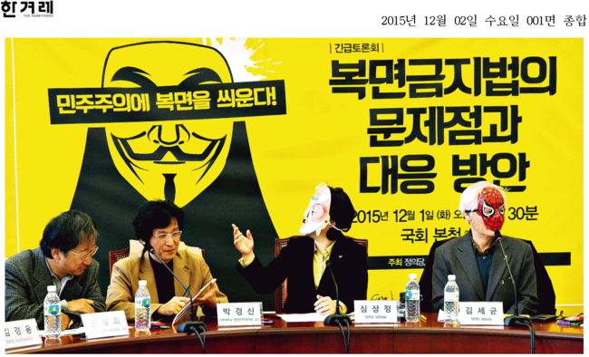 이날 경향신문과 한겨레신문은 1일 국회에서 열린 '복면금지법의 문제점과 대응 방안' 토론회에서 정의당 심상정 대표 등 참석자들이 가면을 쓴 모습을 1면 사진으로 다뤘다. 이날 정의당은 "정부 여당이 추진하는 복면금지법은 시대착오적이며 위헌적인 요소를 내포한 법"이라며 비판했다.