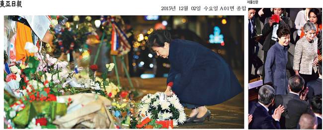 동아일보와 서울신문은 제21차 유엔 기후변화협약 당사국 총회 참석차 프랑스 파리에 있는 박근혜 대통령의 모습을 조명했다. 동아일보는 "박 대통령이 지난달 30일 밤 파리 테러 현장인 바타클랑 극장을 찾아 희생자들을 기리는 헌화를 하고 있다"고 보도했다. 동아에 따르면 박 대통령은 이날 묵념 후 플뢰르 펠르랭 프랑스 문화통신장관에게 "테러 희생자들에 대한 애도를 표하며 항상 프랑스와 함께할 것"이라고 말했다.