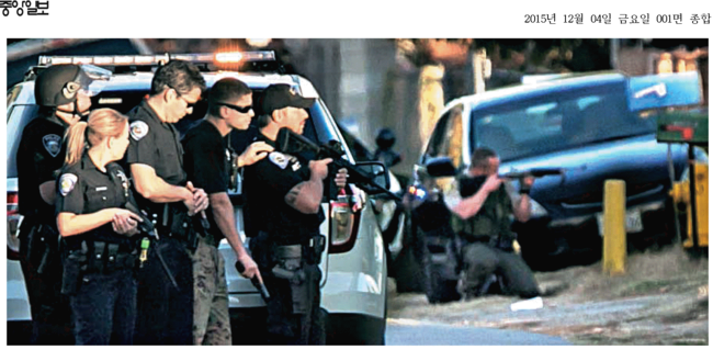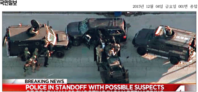 이날 국민일보과 중앙일보는 미국의 총기난사 소식을 1면 사진으로 보도했다. 국민일보는 경찰이 용의자들이 탄 차량을 포위해 검거작전을 벌이고 있는 모습을 중점적으로 다뤘다. 국민일보에 따르면 이날 미국 로스앤젤레스 인근 도시 샌버나디노 장애인 시설 인랜드 리저널 센터에서 2일(현지시간) 무장한 남녀 2명이 총을 난사해 14명이 사망하고 17명이 부상했다.