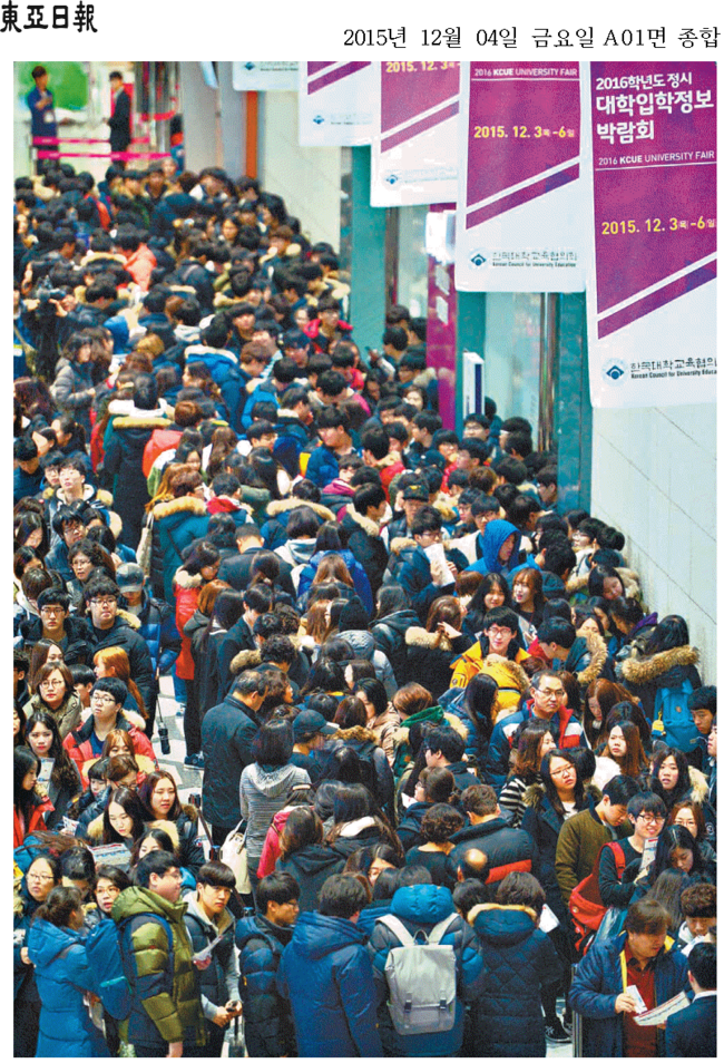 동아일보는 '어려웠던 수능..."내 점수론 어느 대학에"라는 제목의 신문 사설에서 올 수능을 치른 수험생들과 학부모들이 서울 코엑스에서 열린 '2016학년도 정시 대학입학 정보 박람회'에 참석해 길게 줄을 서 있는 모습을 1면 사진에 담았다. 동아는 "올해 갑자기 수능이 어려워지면서 예상만큼의 점수를 받지 못한 수험생들이 불안한 마음에 상담을 받기 위해 몰려들었다"고 전했다.