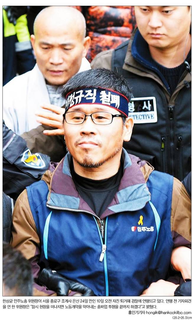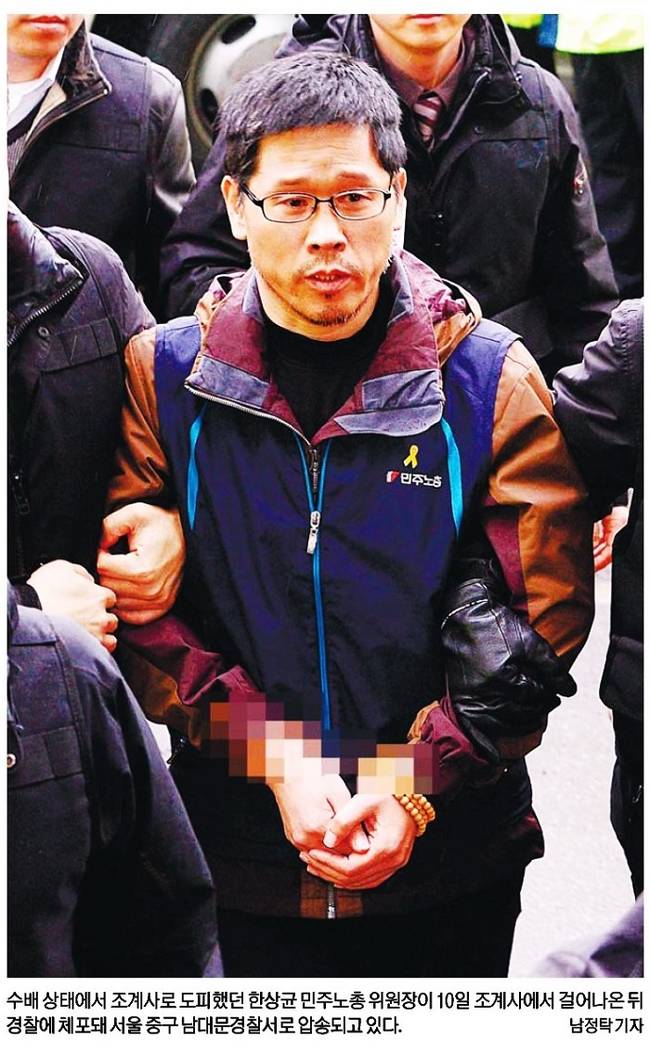 경향신문은 관련기사에서 “한상균 민주노총 위원장은 10일 경찰에 자진출두하기에 앞서 ‘저는 살인범도, 파렴치범도, 강도범죄나 폭동을 일으킨 사람도 아니다. 저는 해고노동자’라고 말했다”며 “박근혜 정부가 5대 노동입법을 밀어붙이면서 자신에게 폭력 이미지를 덧씌운 것을 겨냥한 것”이라고 보도했다. 경향신문은 “민주노총 위원장에게 체포영장이 집행된 것은 이번이 세 번째다. 2001년 단병호 위원장은 명동성당에서 단식농성을 벌이다 자진출두하면서 체포됐고, 2008년 촛불집회를 주최한 혐의로 수배 중이던 이석행 민주노총위원장도 체포된 전례가 있다”고 설명했다.