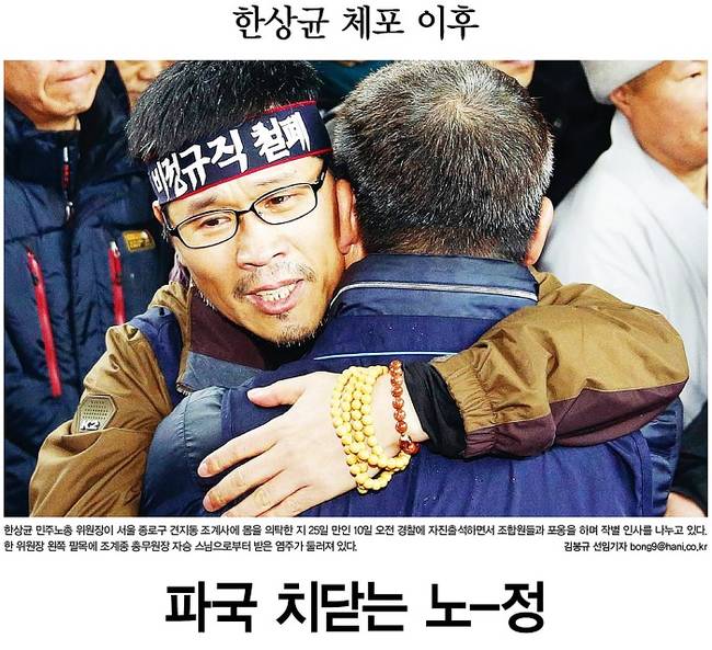 한겨레신문은 한 위원장이 자진출석하면서 조합원들과 포옹을 나누고 있는 모습을 1면 사진으로 선택했다. 한겨레신문은 관련기사에서 “조계종의 중재와 한 위원장의 자진출석 결정으로 물리적 충돌이라는 극단 상황은 피했지만, 노-정 관계는 더욱 파국을 향해 내달릴 것으로 보인다”며 “정부·여당이 노동계가 반대하는 노동개편 방안을 일방적으로 밀어붙이겠다는 뜻을 굽히지 않고 있기 때문”이라고 보도했다. 이어 “지난 9월 노사정 합의에 참여했던 한국노총 역시 정부·여당의 독주탓에 점차 강경한 입장으로 선회하고 있어 노사정 합의도 종이쪽지로 전락할 위험이 커졌다”고 전했다.