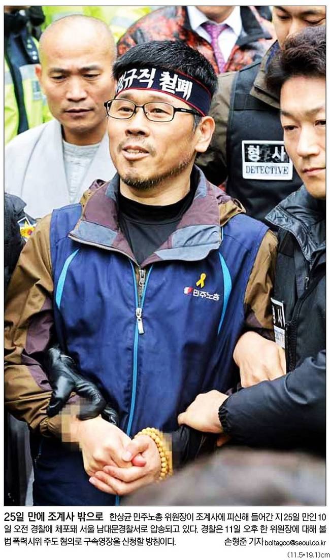 한상균 민주노총위원장이 10일 은신해 있던 조계사에서 나와 경찰에 자진 출두했다. 경찰의 추적을 피해 지난달 16일 조계사에 들어간 지 25일 만이다. 물리적 충돌은 피했지만 노-정 관계는 더욱 악화될 것으로 전망된다. 11일 모든 주요 일간지들은 이와 관련된 소식을 다룬 사진을 신문 전면에 내걸었다.