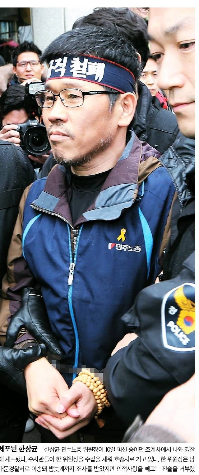 세계일보는 경찰에 체포돼 압송되는 한 위원장의 모습을 전면 사진으로 내걸었다. 세계일보는 관련기사에서 “10일 체포돼 서울 남대문경찰서에서 조사를 받고 있는 한상균 민주노총 위원장이 묵비권을 행사하고 있는 것으로 알려졌다”며 “한 위원장에게 적용된 혐의는 일반 교통방해, 해산명령 불응, 특수공무집행방해, 특수공무집행방해치상, 특수공용물건손상 등이다”라고 전했다. 이어 검·경은 한 위원장에 대해 ‘다중이 집합해 폭행, 협박 또는 손괴 행위를 한 자’를 처벌하는 형법상 소요죄를 적용하기 위해 법리검토에 착수했다“며 ”1987년 인천의 민정당사가 불탄 ‘5·3인천사태’이후 소요죄가 적용된 사례는 없다“고 전했다.