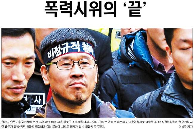 한국일보는 10일 오전 자진 퇴거해 경찰에 연행되고 있는 한상균 위원장의 모습을 1면 사진으로 선택했다.
