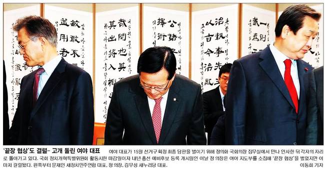 국민일보, 세계일보, 한겨레는 여야 대표가 15일 선거구 획정 최종 담판을 벌이기 위해 정의화 국회의장 집무실에서 만나 인사한 뒤 각자의 자리로 돌아가고 있는 모습을 담았다.