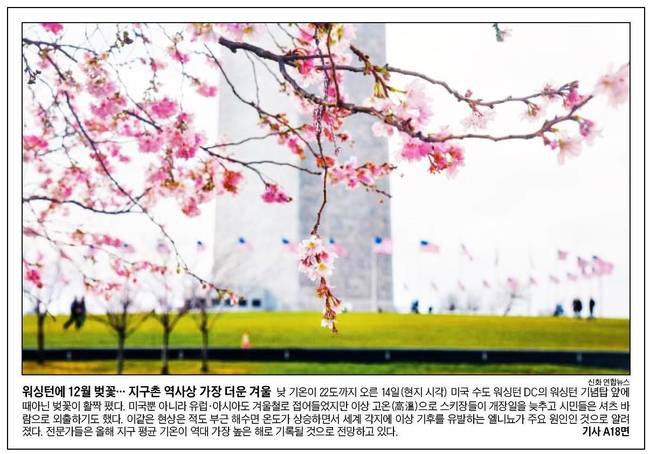 조선일보도 미국 워싱턴 DC의 워싱턴 기념탑 앞에 때아닌 벚꽃이 활짝 핀 모습을 전했다.
