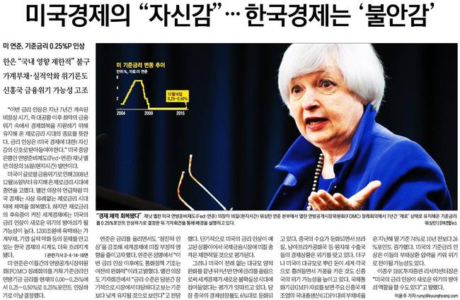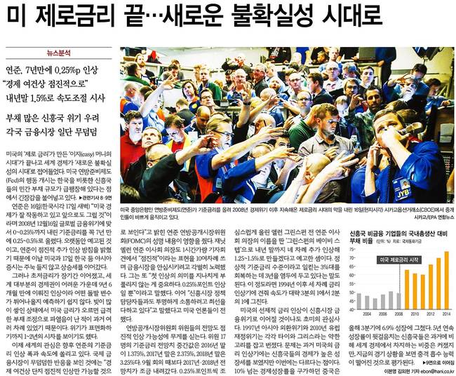 미국은 제로금리 시대 덕에 체력을 회복한 반면 제로금리의 후유증이 커진 세계경제에는 미국의 금리인상이 새로운 위기의 방아쇠가 될 가능성이 높다고 경향신문은 보도했다.