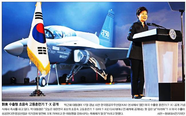 국민일보, 한국일보는 박근혜 대통령이 17일 경남 사천 한국항공우주산업(KAI) 본사에서 열린 미국 수출형 훈련기(T-X) 공개 기념식에서 축사를 하고 있는 모습을 담았다.