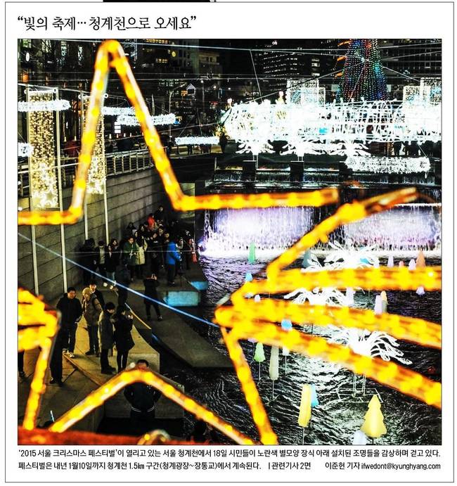 경향신문은 19일 1면 사진으로 '2015서울 크리스마스 페스티벌'이 열리고 있는 서울 청계천에서 18일 시민들이 노란색 별모양 장식 아래 설치된 조명들을 감상하며 걷고 있는 모습을 담았다.