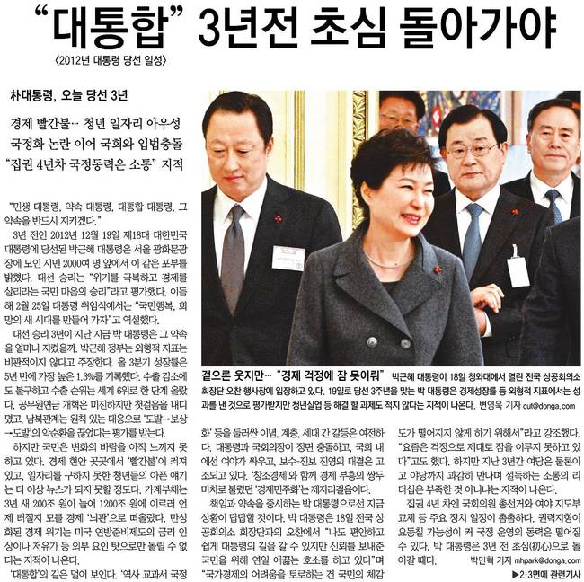 19일로 당선 3주년을 맞는 박 대통령은 경제성장률 등 외형적 지표에서는 성과를 낸 것으로 평가받지만 청년실업 등 해결 할 과제도 적지 않다는 지적이 나온다고 동아일보는 보도했다.