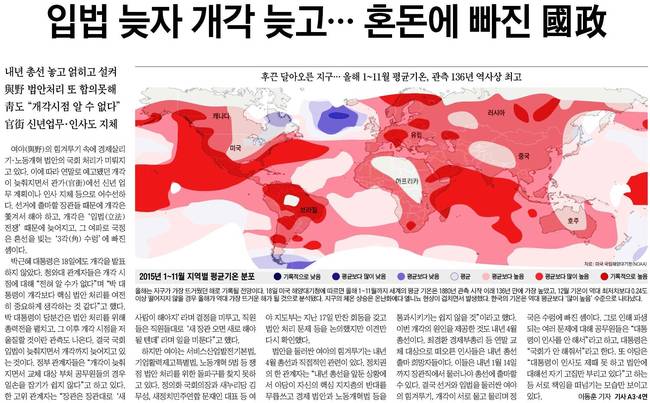 조선은 2015년 1~11월 세계 지역 평균기온 분포 그래픽을 1면 사진으로 실었다. 18일 미국 해양대기청에 따르면 올해 1~11월 세계의 평균 기온은 1880년 관측 시작 이래 136년 만에 가장 높았고, 12월 기온이 역대 최저치보다 0.24도 이상 떨어지지 않을 경우 올해가 역대 가장 뜨거운 해가 될 것으로 분석됐다.