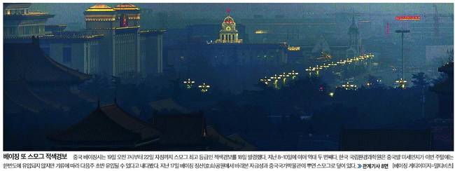 중국 베이징시는 19일 오전 7시부터 22일 자정까지 스모그 최고 등급인 적색경보를 18일 발령했다.