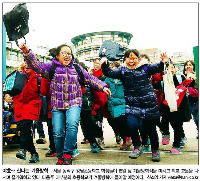한겨레는 서울 동작구 강남초등학교 학생들이 18일 낮 겨울방학식을 마치고 학교 교문을 나서며 즐거워하고 있는 장면을 실었다. 다음주 대부분의 초등학교가 겨울방학에 들어갈 예정이다.