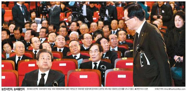 한국일보는 정의화 국회의장이 18일 국회 의원회관에서 열린 이만섭 전 국회의장 영결식에 참석하다 김무성 새누리당 대표와 눈인사를 나누고 있는 장면을 전했다.
