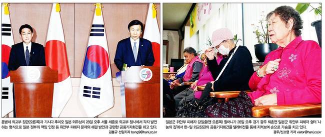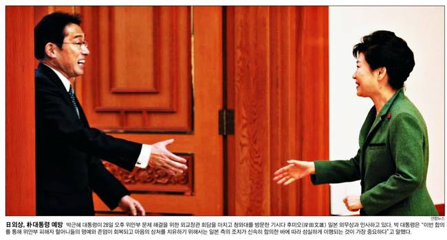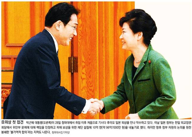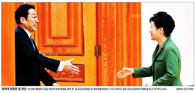 이를 두고 한·일관계가 개선될 것이라는 평가가 있지만, 일본의 법적 책임을 명시하지 않았다는 비판도 나온다. 29일 대부분의 종합일간지는 박근혜 대통령이 청와대를 방문한 기시다 후미오 일본 외무상과 인사 나누는 장면을 1면 사진에 싣고 다양한 분석을 내놨다.