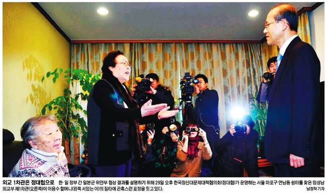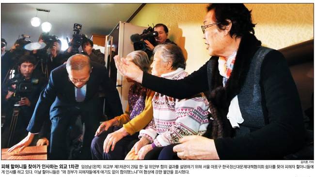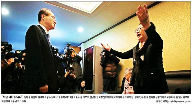 비판여론을 달래기 위해 임성남 외교부 1차관 등이 29일 위안부 피해 할머니들을 찾아 합의 내용과 후속조치를 설명했다. 하지만 할머니들은 거세게 반발하며 정부의 잘못을 따져 물었다.