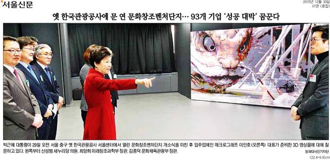 서울신문은 1면 머리기사에서 "글로벌 문화 융·복합 콘텐츠 양성소를 꿈꾸는 실리콘밸리들의 인큐베이터와 같은 기능을 하는 코리아 문화창조벤처단지가 29일 문을 열었다"며 "박 대통령은 개소식에서 "문화창조벤처단지가 문화콘텐츠 산업의 큰 발전을 선도하여 신산업을 일으키고 365일 멈추지 않는 경제재도약의 심장이 되기를 기대한다"고 말했다"고 보도했다.