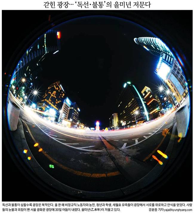 경향신문은 "독선과 불통이 심할수록 광장은 북적인다. 올 한 해 비정규직 노동자와 농민, 청년과 학생, 세월호 유족들이 광장에서 서로를 위로하고 안식을 얻었다. 사람들의 눈물과 외침이 벤 서울 광화문 광장에 30일 어둠이 내렸다"며 360도 카메라로 찍은 광장의 모습을 1면에 실었다.