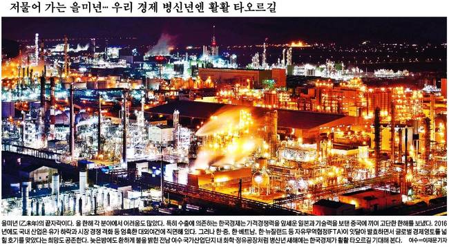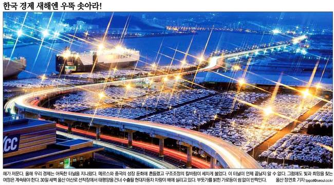 서울신문과 세계일보는 각각 새벽·늦은 밤 환하게 불이 켜있는 울산 아산로 선착장과 전남 여수 국가산업단지 내 화학·정유공장의 모습을 1면에 실어 내년도 경제 활성화에 초점을 맞췄다.