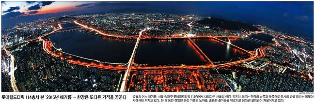조선일보는 서울 송파구 롯데월드타워 114층에서 내려다본 서울의 야경을 전하면서 "유유히 흐르는 한강의 남쪽과 북쪽으로 도시의 밤을 밝히는 불빛이 차례차례 켜지고 있다"며 "한 해 동안 겪었던 온갖 기쁨과 노여움, 슬픔과 즐거움을 뒤로하고 2015년 을미년이 저물어가고 있다"고 설명했다.