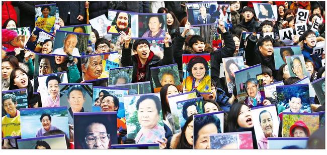 <!--[if !supportEmptyParas]--><!--[endif]-->한겨레는 30일 '1211차 일본군 위안부 문제 해결을 위한 정기 수요집회'에서 참석자들이 돌아가신 위안부 피해 할머니들의 사진을 들고 대사관 쪽을 향해 한-일 정부의 위안부 피해자 문제 관련 합의를 반대하는 구호를 외치는 모습을 담았다.