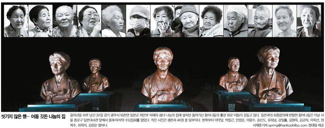 한국일보도 경기 광주시 퇴촌면 일본군 위안부 피해자 쉼터 나눔의 집에 설치된 돌아가신 할머니들의 흉상 위로 어둠이 깃든 모습과 생존자 할머니 일부의 모습을 함께 전했다.