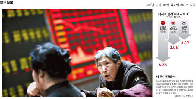 새해 첫 거래일부터 아시아 주요국 증시가 중국 증시 폭락의 여파로 줄줄이 급락세로 마감했다. 이란과 사우디아라비아의 관계가 급속도로 얼어붙으며 불안감이 조성된데다 글로벌 경기둔화 우려까지 겹치며 잔뜩 움츠린 투자심리를 패닉으로 몰아갔다.