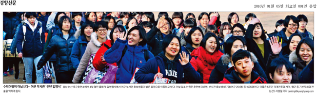 경향신문과 동아일보, 중앙일보는 이날 여군 부사관의 신년 입영식 모습을 1면 사진에 담았다. 경향신문은 “충남 논산 육군훈련소에서 4일 열린 올해 첫 입영행사에서 여군 부사관 후보생들이 밝은 표정으로 이동하고 있다”며 “입소 인원은 훈련병 708명, 부사관 후보생 987명(여군 251명)등 1695명”이라고 보도했다.