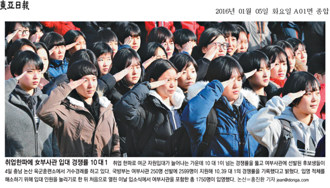 동아일보도 "취업 한파로 여군 자원입대가 늘어나는 가운데 10대1이 넘는 경쟁률을 뚫고 여부사관 후보생들이 선발됐다”고 전했다. 동아는 이날 “여부사관 250명 선발에 2599명이 지원해 10.39대1의 경쟁률을 기록했다”고 덧붙였다.