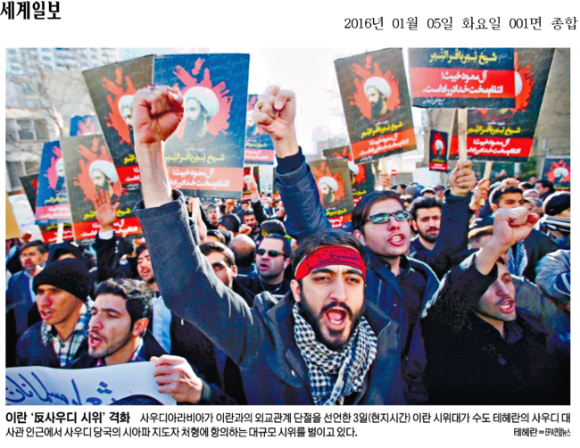 이날 세계일보와 한겨레신문은 급격하게 관계가 경색된 사우디아라비아와 이란 소식을 1면 사진으로 전했다. 세계일보는 “사우디아라비아가 이란과의 외교관계 단절을 선언한 3일 이란 시위대가 수도 테헤란의 사우디 대사관 인근에서 사우디 당국의 시아파 지도자 처형에 항의하는 대규모 시위를 벌이고 있다”고 보도했다.