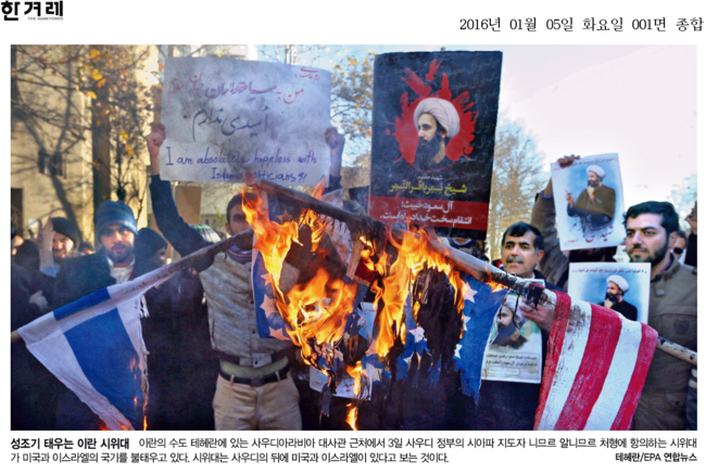 한겨레신문도 “이날 시아파 지도자 처형에 항의하는 시위대가 미국과 이스라엘의 국기를 불태우고 있다”며 관련 소식을 전했다. 한겨레는 “이란의 시위대가 사우디의 뒤에 미국과 이스라엘이 있다고 보고 있다”고 덧붙였다.