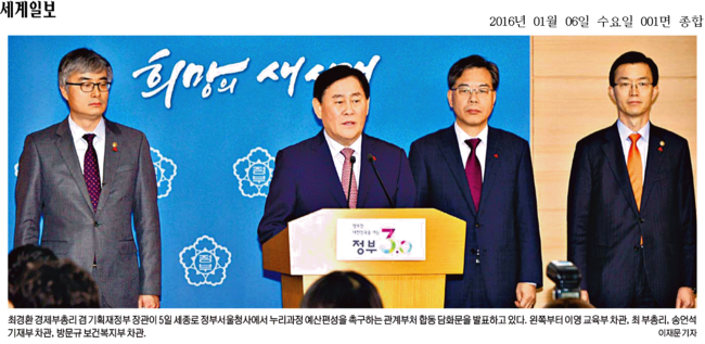 정부는 지난 5일 정부서울청사에서 누리과정과 관련한 긴급 관계부처 합동브리핑을 열어 누리과정 예산이 편성되지 않은 시도교육청에 대한 압박수위를 높였다. 6일 경향신문과 세계일보는 이와 관련한 소식을 1면 사진으로 보도했다. 경향은 “정부와 교육청 사이의 대립이 강 대 강으로 맞서며 극한으로 치닫고 있다”고 전했다.