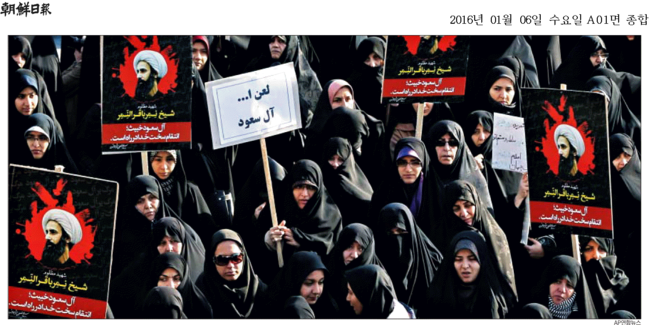조선일보와 중앙일보, 동아일보는 급격하게 관계가 경색된 사우디아라비아와 이란 소식을 일제히 보도했다. 이란은 지난 3일 사우디 대사관 인근에서 사우디 당국의 시아파 지도자 처형에 항의하는 대규모 시위를 벌였다. 조선일보는 히잡을 쓴 여성들이 시아파 지도자 초상화가 들어간 피켓을 들고 테헤란 거리로 몰려나와 항의 시위를 벌이고 있는 모습을 1면 사진에 담았다.
