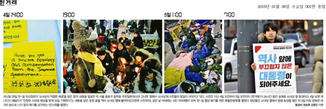 이날 한겨레신문은 서울 종로구 주한일본대사관 건너편 ‘평화비 소녀상’ 앞에 수백여 명이 시민들이 찾는 모습을 1면 사진으로 보도했다. 한겨레에 따르면 시민 100여명은 ‘한일 협상 폐기를 위한 촛불문화제’를 열고 청년들은 소녀상 옆에서 밤샘 농성을 벌인 뒤 광화문 네거리 등으로 나가 합의 폐기를 요구하는 1인 시위를 벌였다.