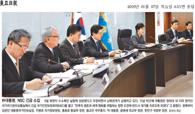 동아일보도 “북한이 수소폭탄 실험에 성공했다고 주장하면서 남북관계가 급랭하고 있다”며 “이날 박근혜 대통령은 청와대 내 지하 벙커인 국가위기관리상황실에서 긴급 국가안전보장회의를 열고 ‘세계 평화를 위협하는 정면 도전에 반드시 대가를 치르도록 하겠다’고 말했다”고 보도했다.