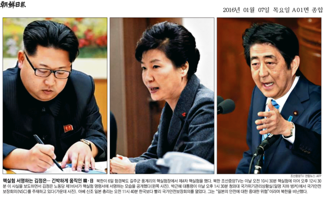 이날 조선일보는 <핵실험 서명하는 김정은...긴박하게 움직인 한일>이라는 제목의 1면 사진설명을 통해 관련 소식을 전했다. 조선은 “아베 신조 일본 총리는 오전 11시40분 한국보다 빨리 국가안전보장회의를 열고 ‘일본 안전에 대한 중대한 위협’이라고 말했다”고 보도했다.