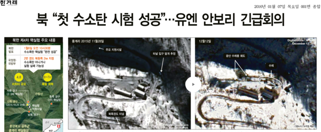 이날 경향신문과 동아일보, 조선일보, 중앙일보. 한겨레신문 등 대다수의 주요일간지는 이번 북한의 핵실험과 관련한 소식을 1면 톱으로 보도했다. 경향신문은 <북, 깜짝 4차 핵실험...국제사회 향한 ‘김정은의 핵도박’>이라는 헤드라인으로 “미국이 대통령 선거 국면에 들어가고 북중관계가 소원해진 상태에서 이뤄진 이번 핵실험으로 북핵 문제는 동북아시아는 물론 세계안보질서에 중대 변수로 떠오를 것”이라고 전했다. 경향은 이어 “지난해 8.25 합의 이후 형성된 남북관계 개선에 대한 기대감도 소멸될 것”이라고 분석했다.