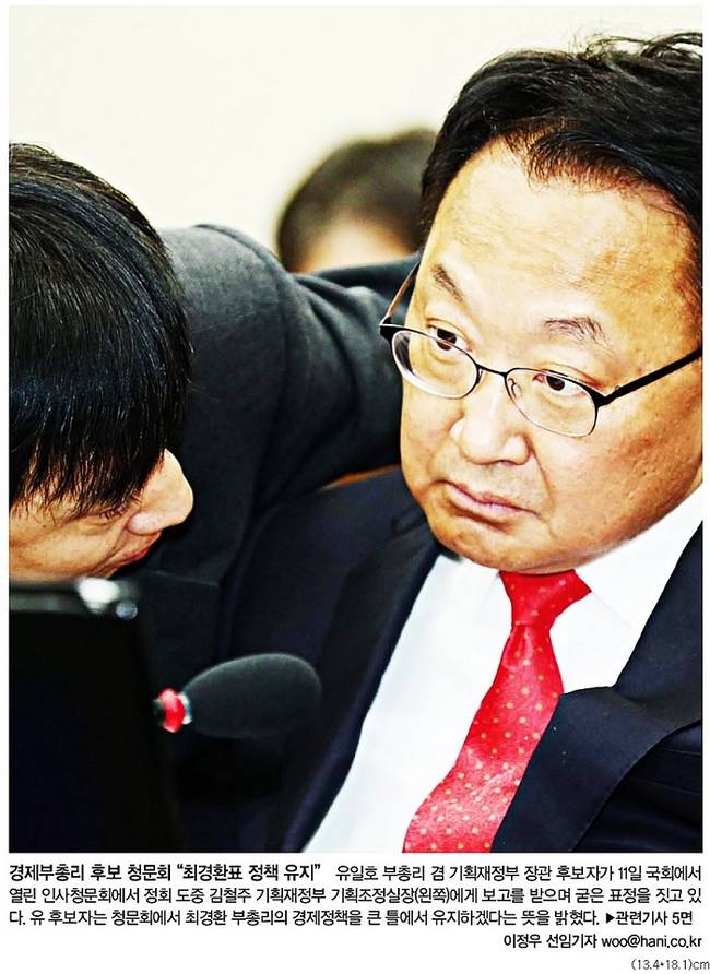 한겨레신문은 관련기사에서 “박근혜 정부의 3기 경제팀을 이끌어갈 유일호 부총리 겸 기획재정부 장관 후보자에 대한 국회 인사청문회에서 정부의 경제정책 방향과 올해 성장률 목표, 정책수행 능력 등을 놓고 공방이 벌어졌다”며 “유 후보자는 큰 틀에서 최경환 부총리의 경제정책을 유지하겠다는 뜻을 밝혔으며 △가계부채 △노동시장 개편 △누리과정 예산 △미국·중국 등 대외 리스크 등 산적한 현안에 대해서는 대부분 ‘최선을 다하겠다’는 원론적인 답변에 그쳤다”고 전했다.