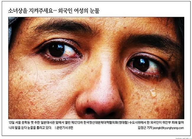 경향신문은 이날 일본군 위안부 피해자 할머니들과 관련된 소식을 다루며 옛 주한 일본대사관 앞에서 열린 제1213차 한국정신대문제대책협의회 수요시위에서 한 외국인이 위안부 피해자 할머니의 말을 듣다 눈믈을 흘리는 모습을 신문 전면에 내걸었다. 경향신문은 관련기사에서 “일본군 위안부 피해자 할머니들이 13일 한·일 위안부 합의 내용에 대해 ‘절대적으로 반대한다’며 무효화를 촉구했다”며 “공식출범을 앞둔 ‘한·일 일본군 위안부 합의 무효와 정의로운 해결을 위한 전국행동’이 계획 중인 재단 설립에도 참여할 뜻을 밝혔다”고 보도했다.