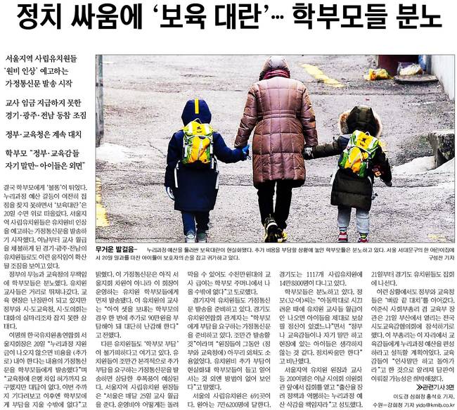 국민일보는 누리과정 예산을 둘러싼 보육대란이 현실화됐다며 서울 서대문구의 한 어린이집에서 20일 일과를 마친 아이들이 보호자의 손을 잡고 귀가하고 있는 모습을 담았다.