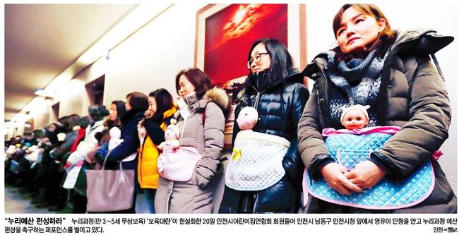 세계일보, 한국일보도 누리과정(만3~5세 무상보육) '보육대란'이 현실화한 20일 인천시어린이집연합회 회원들이 인천시 남동구 인천시청 앞에서 영유아 인형을 안고 누리과정 예산편성을 촉구하는 퍼포먼스를 벌이고 있는 장면을 담았다.