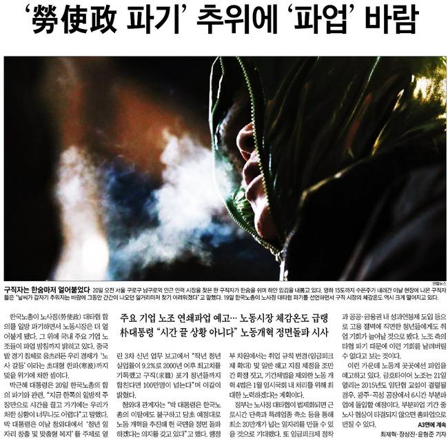 조선일보는 20일 오전 서울 구로구 남구로역 인근 인력 시장을 찾은 한 구직자가 한숨을 쉬며 하얀 입김을 내뿜고 있는 모습을 전했다. 지난 19일 한국노총이 노사정 대타협 파기를 선언하면서 구직 시장의 체감온도 역시 크게 떨어지고 있다고 전했다.