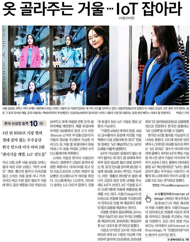 중앙일보는 서울 삼성동 코엑스 럭키 슈에트 매장에서 20일 스마트 거울이 한 여성이 입어본 네 가지 코트를 보여주고 있는 장면을 담았다.