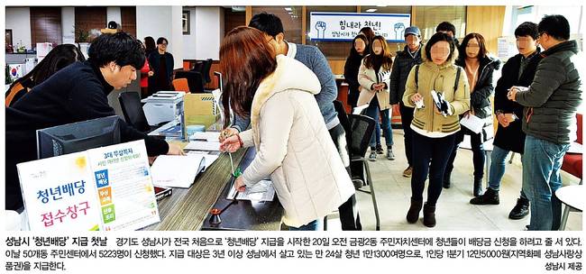 한겨레는 경기도 성남시가 전국 처음으로 '청년배당'지급을 시작한 20일 오전 금광2동 주민자치센터에 청년들이 배당금 신청을 하려고 줄 서 있는 모습을 전했다.